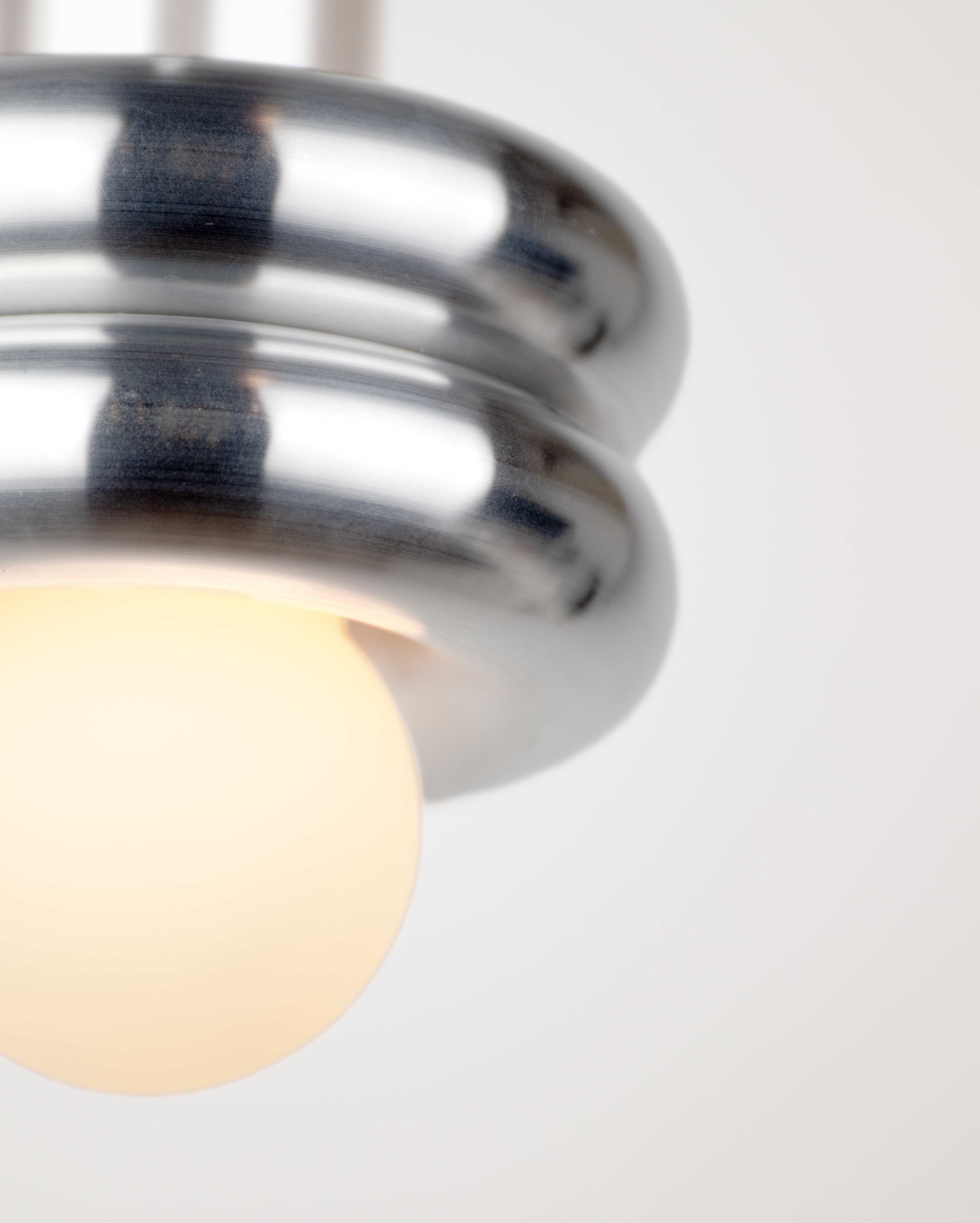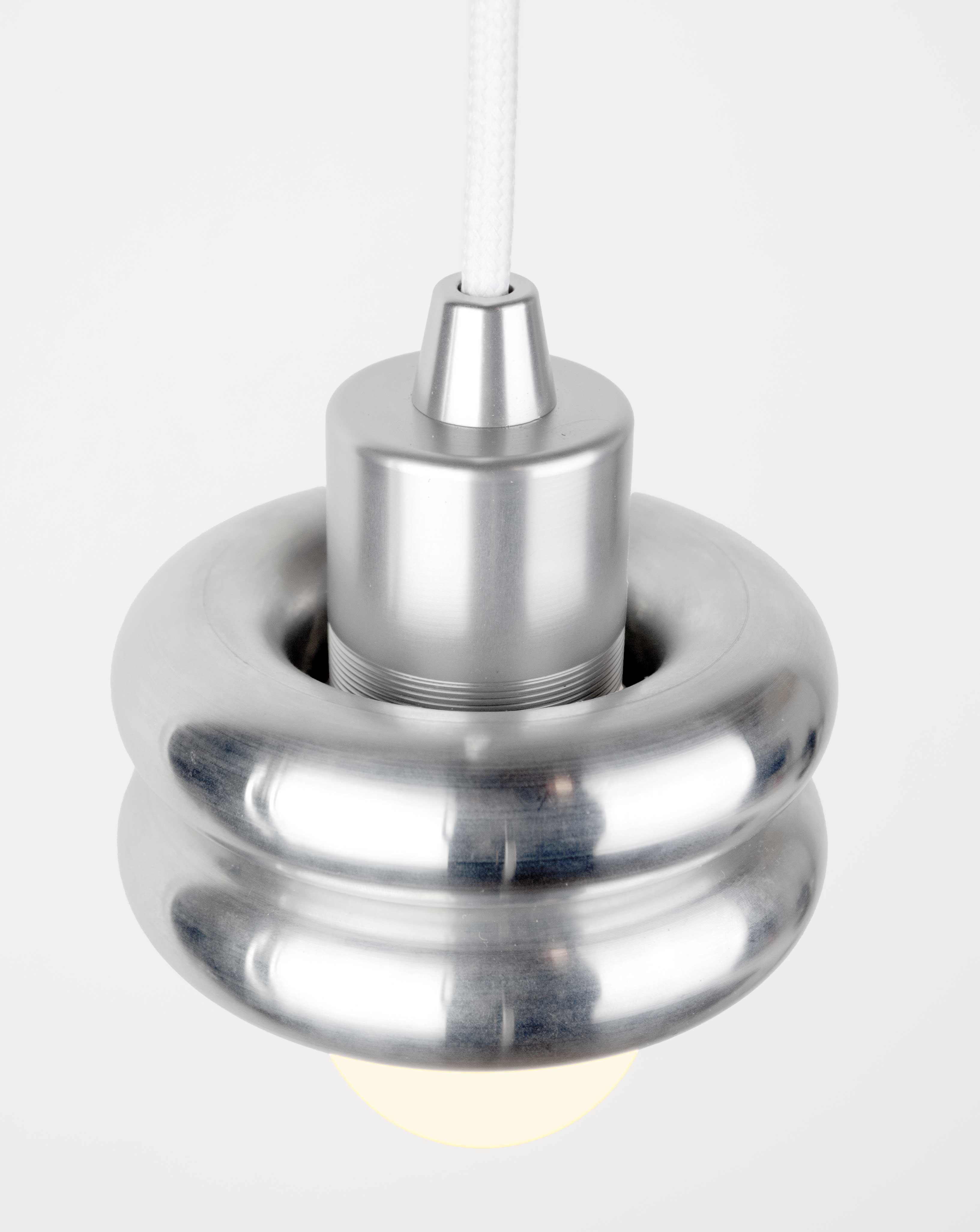 A compact pendant lamp made of two stacked aluminum donut shapes. Fitted with an E27 socket. A cord and bulb are included with your purchase. Designed and crafted in Sweden.
