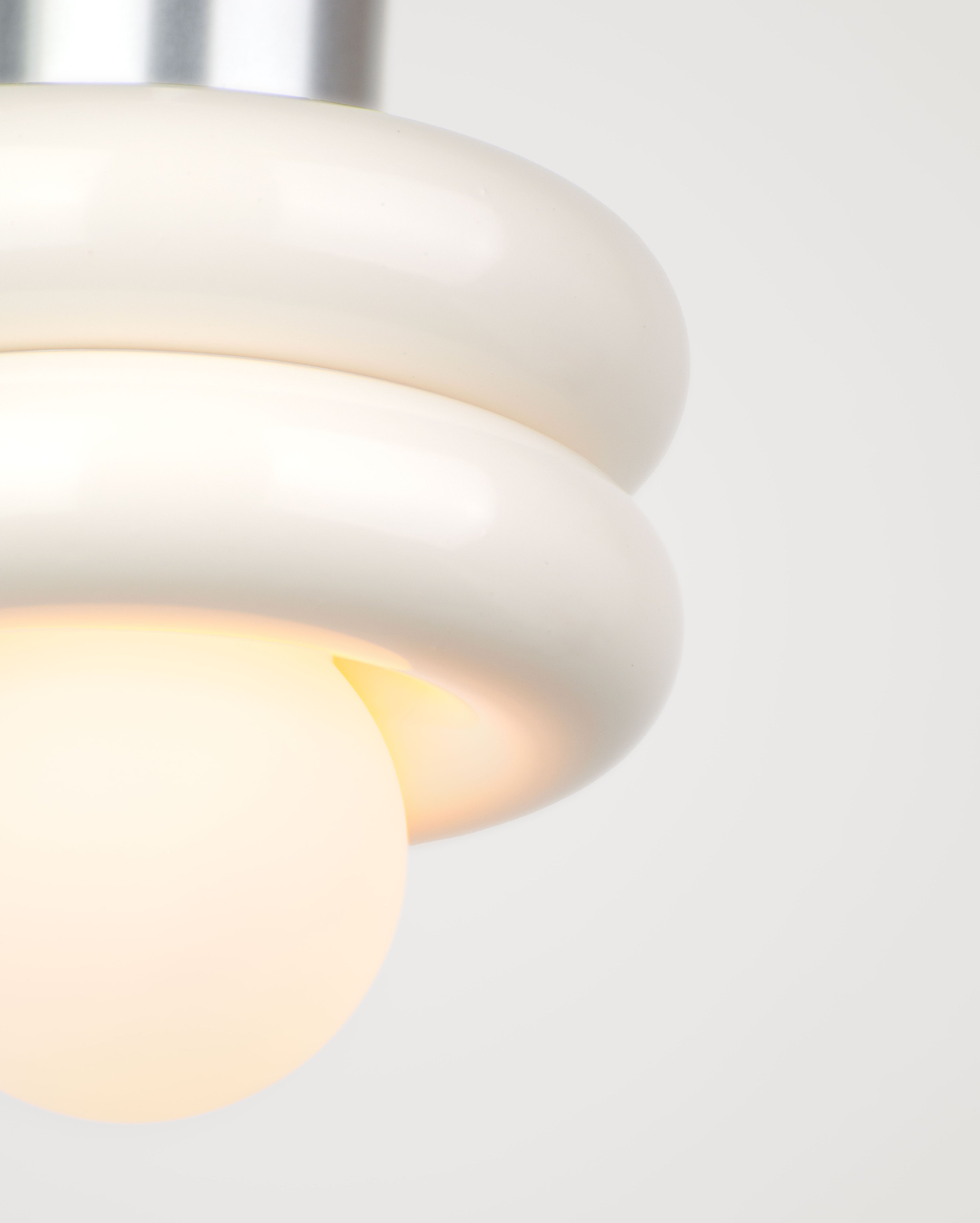 Donut pendant lamp by HAHA studio. A compact lamp made of two stacked aluminum donut shapes in soft off-white.