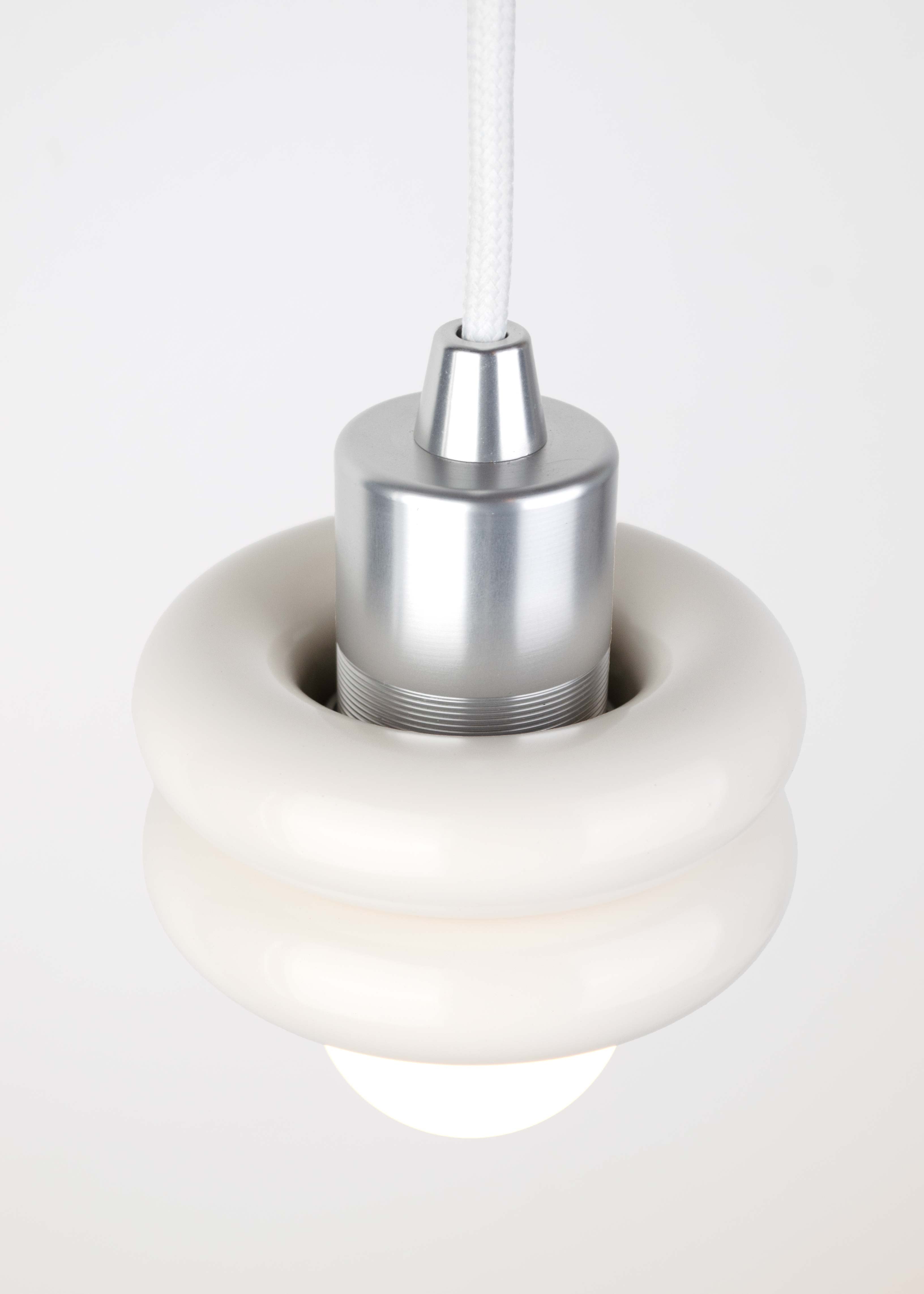 A compact pendant lamp made of two stacked aluminum donut shapes. Fitted with an E27 socket. A cord and bulb are included with your purchase. Designed and crafted in Sweden.