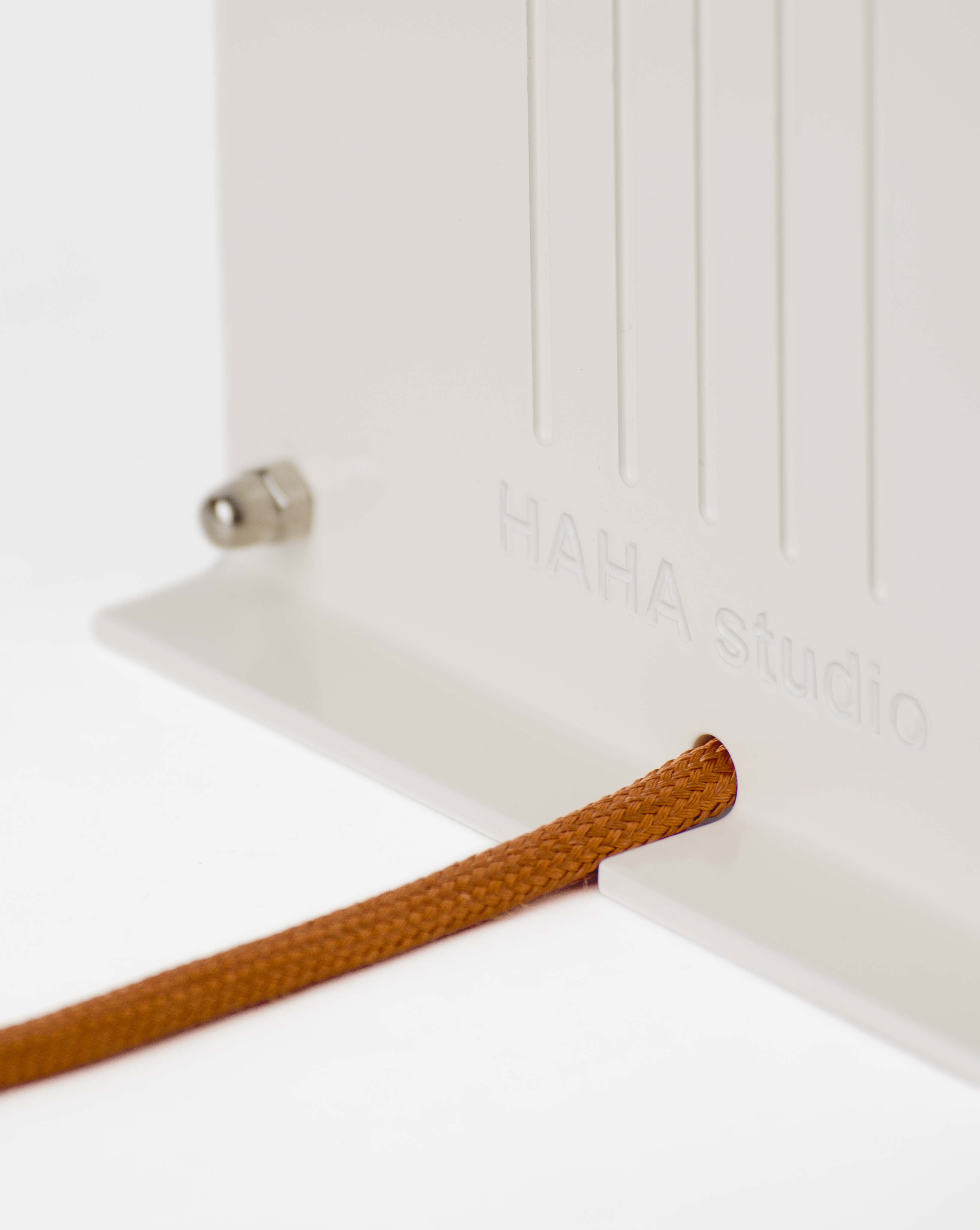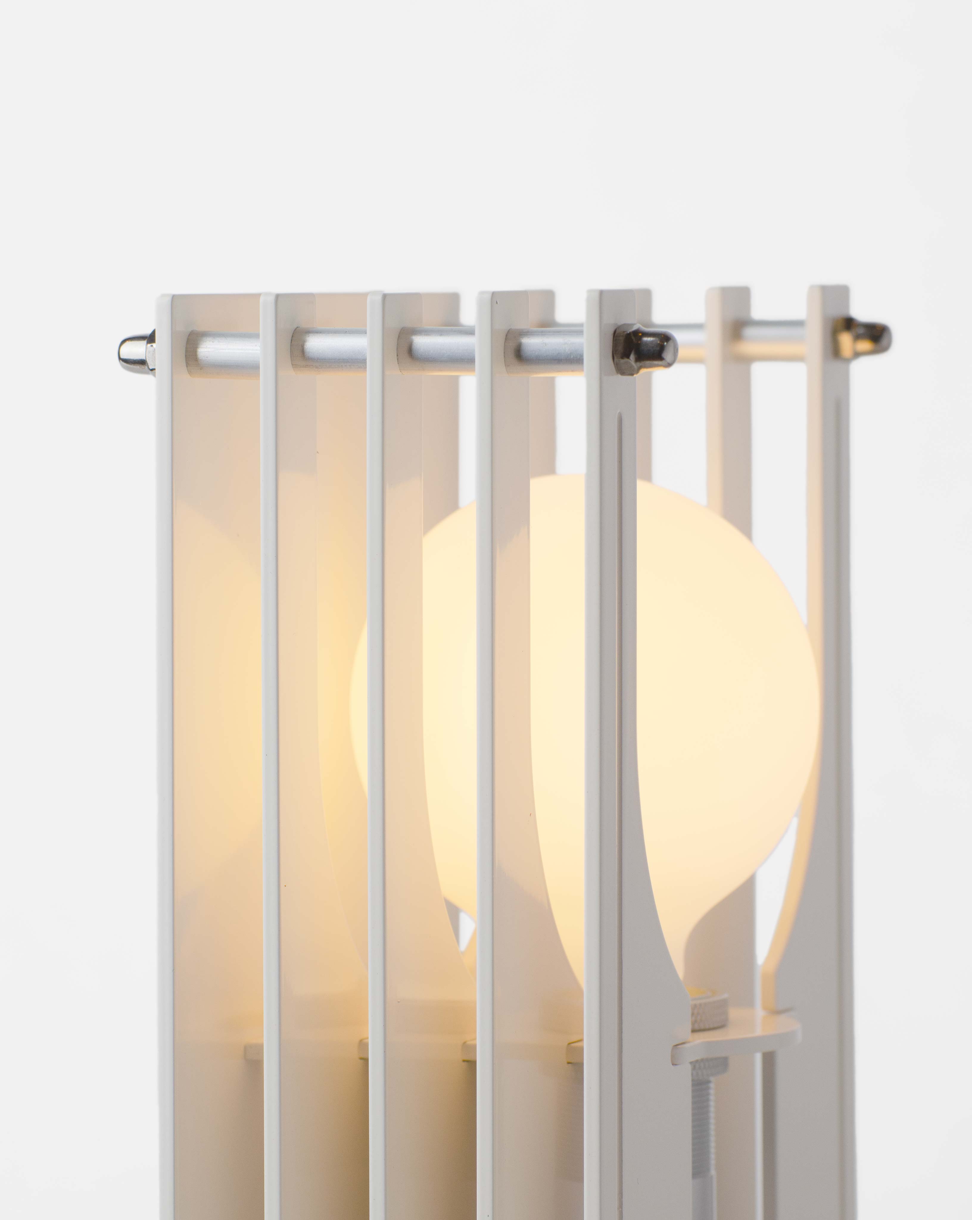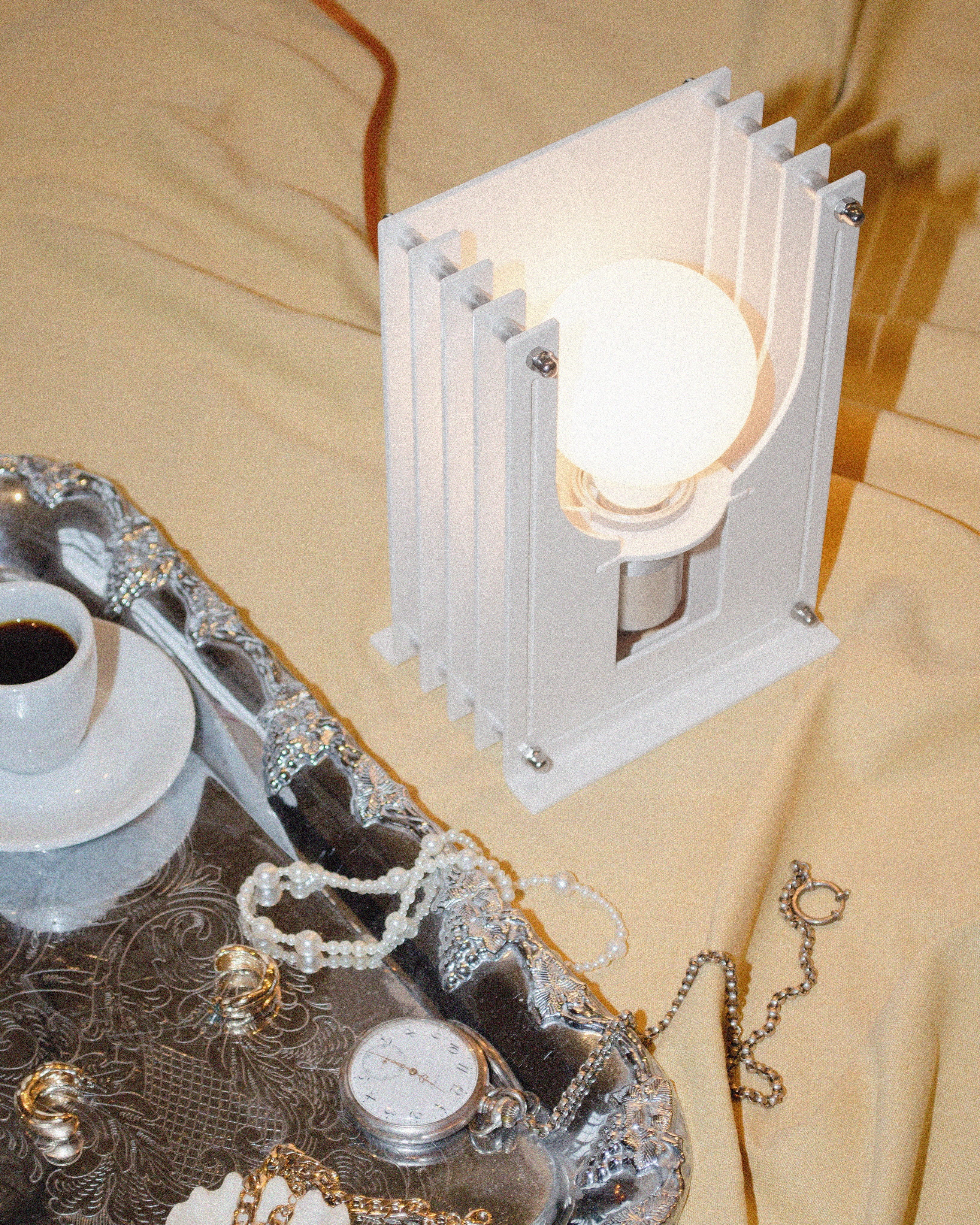 Grid table lamp by HAHA studio. Built from soft off-white stacked aluminum sheets, where the spacing creates a soft, warm light.