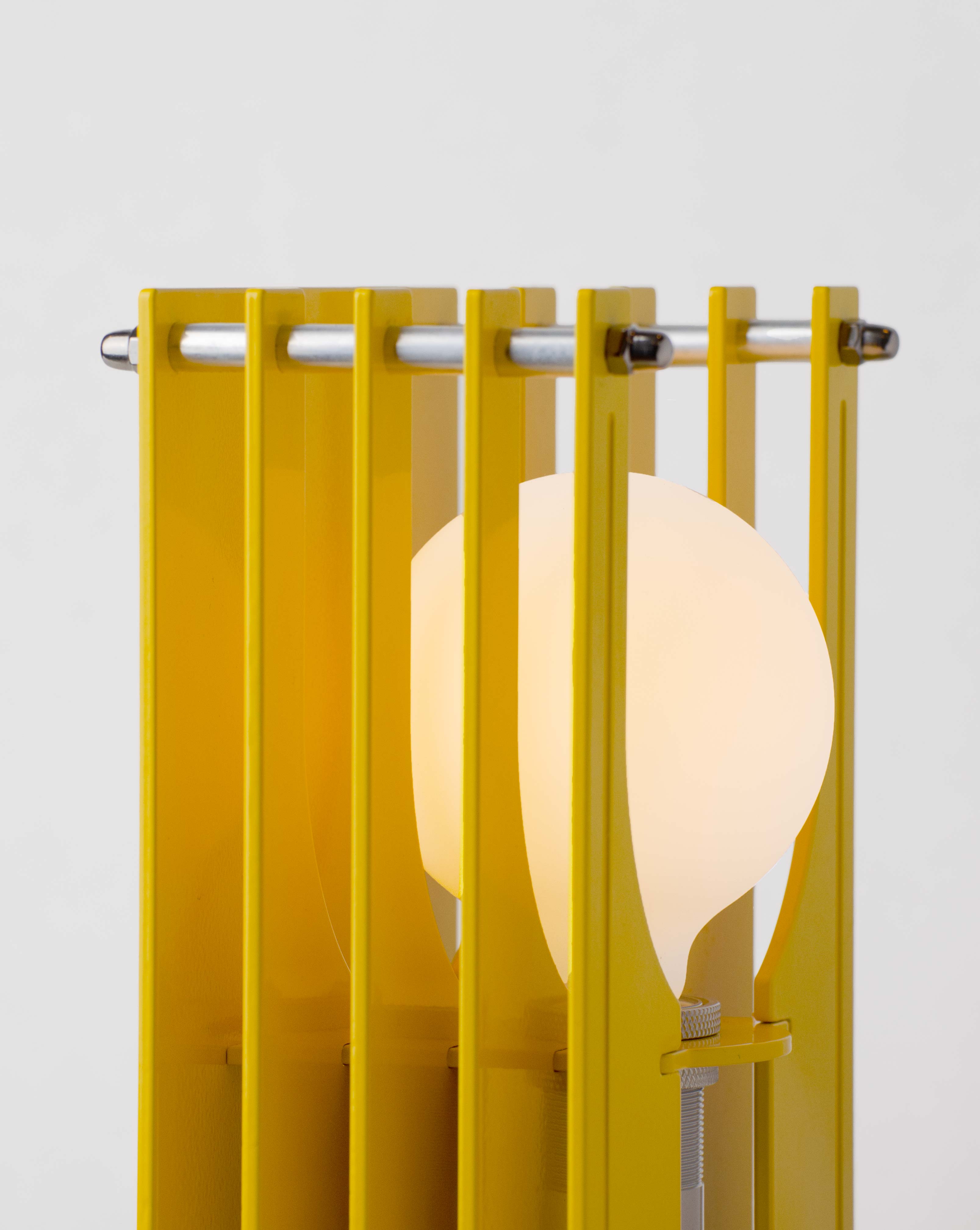 Grid table lamp by HAHA studio. Built from bright yellow stacked aluminum sheets, where the spacing creates a soft, warm light.