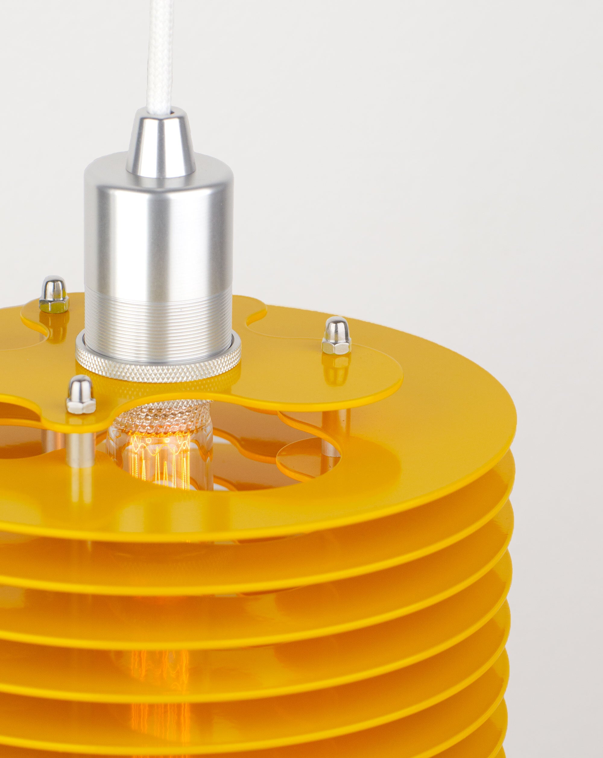The Splash pendant lamp consists of aluminum discs assembled together. The spacing between the discs allows the light to further spread through the fixture. A long extruded LED bulb ties the piece together. Fitted with an E27 socket. A cord and bulb are included with your purchase. Designed and crafted in Sweden.
