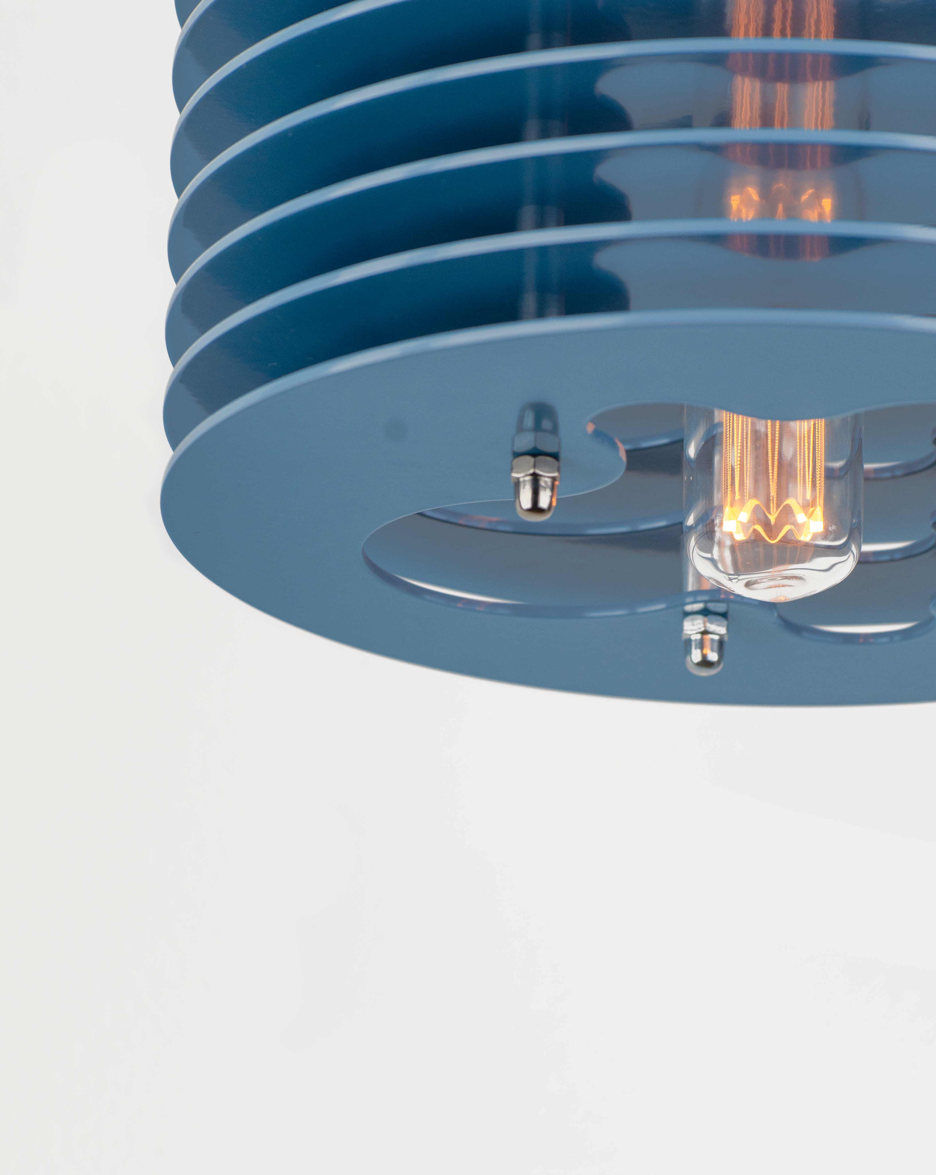 Splash pendant lamp by HAHA studio. Soft blue discs assembled with spacing, creating a soft, warm light.