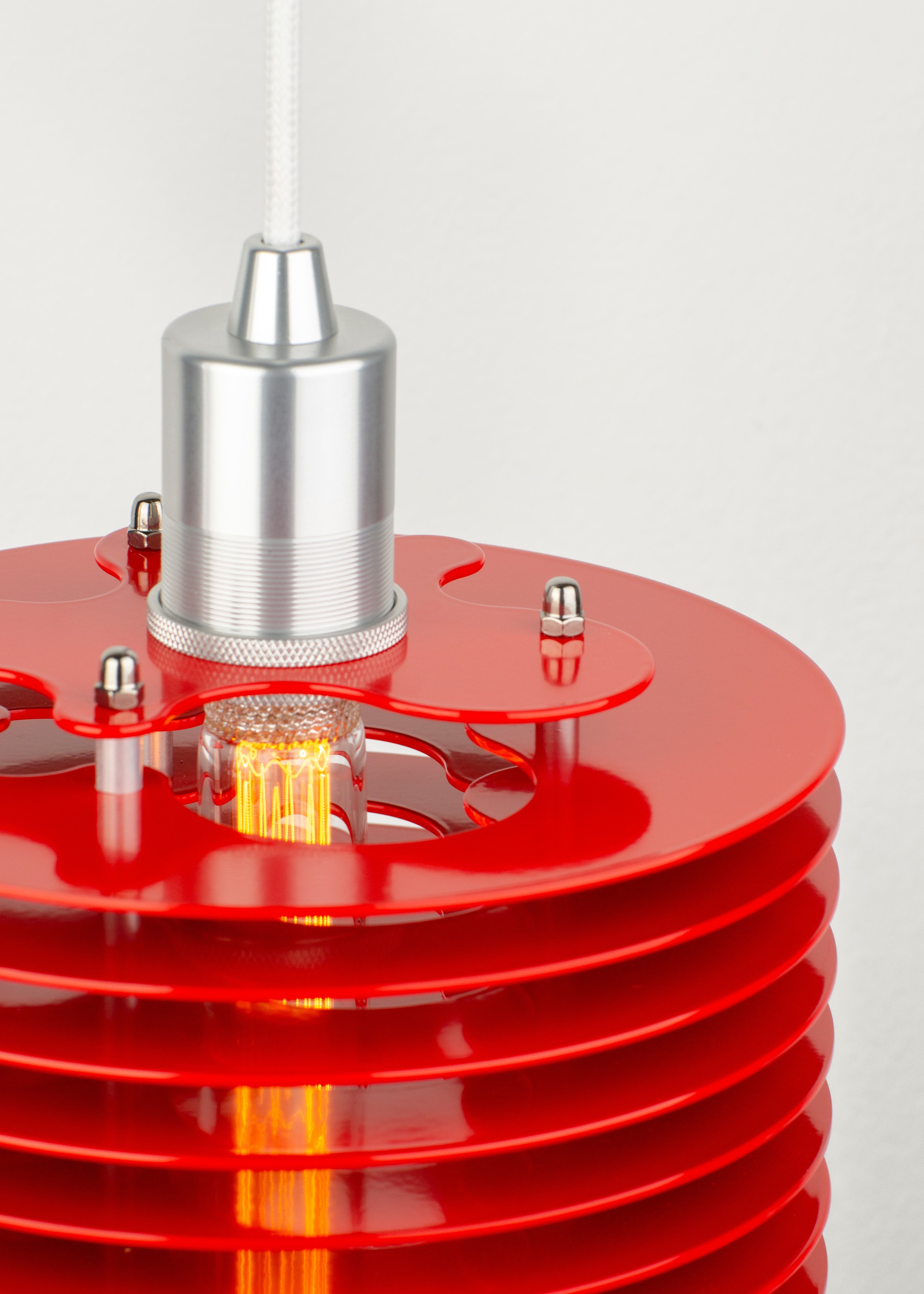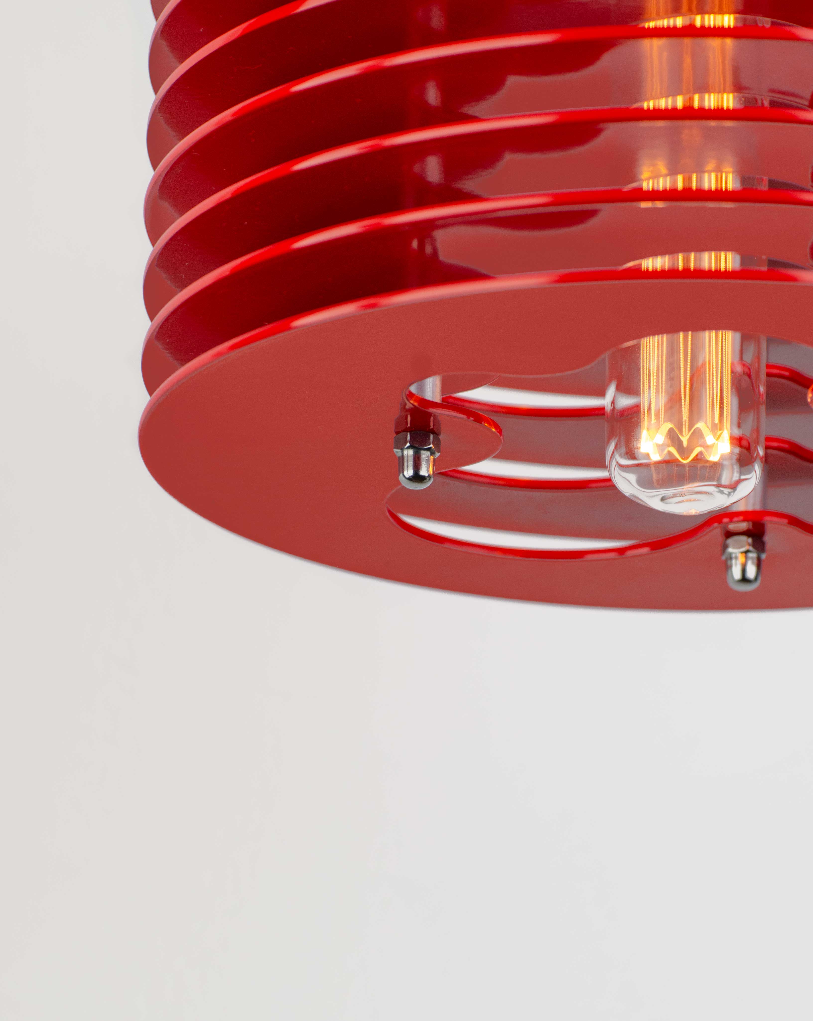 Splash pendant lamp by HAHA studio. Bright red discs assembled with spacing, creating a soft, warm light.